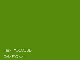 Hex #568b0b Color is a dark green color and the nearest color is Avocado #568203. Hex code #568b0b and RGB value is rgb(86,139,11). In RGB color space, this color is composed of 34% red, 55% green, 4% blue, In CMYK color space, this color is composed of 38% cyan, 0% magenta, 92% yellow , 45% black , In HSL color space, this color has a hue angle of 85° , 85% saturation and 29% lightness.