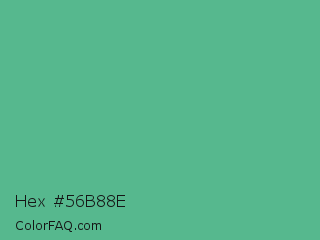 Hex #56b88e Color is a normal green color and the nearest color is Ocean Green #48bf91. Hex code #56b88e and RGB value is rgb(86,184,142). In RGB color space, this color is composed of 34% red, 72% green, 56% blue, In CMYK color space, this color is composed of 53% cyan, 0% magenta, 23% yellow , 28% black , In HSL color space, this color has a hue angle of 154° , 41% saturation and 53% lightness.