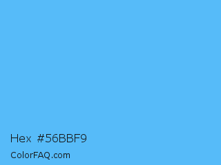 Hex #56bbf9 Color is a light blue color and the nearest color is Blue Jeans #5dadec. Hex code #56bbf9 and RGB value is rgb(86,187,249). In RGB color space, this color is composed of 34% red, 73% green, 98% blue, In CMYK color space, this color is composed of 65% cyan, 25% magenta, 0% yellow , 2% black , In HSL color space, this color has a hue angle of 203° , 93% saturation and 66% lightness.