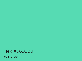 Hex #56dbb3 Color is a normal green color and the nearest color is Medium Aquamarine #66ddaa. Hex code #56dbb3 and RGB value is rgb(86,219,179). In RGB color space, this color is composed of 34% red, 86% green, 70% blue, In CMYK color space, this color is composed of 61% cyan, 0% magenta, 18% yellow , 14% black , In HSL color space, this color has a hue angle of 162° , 65% saturation and 60% lightness.