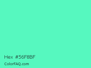 Hex #56f8bf Color is a light green color and the nearest color is Turquoise #40e0d0. Hex code #56f8bf and RGB value is rgb(86,248,191). In RGB color space, this color is composed of 34% red, 97% green, 75% blue, In CMYK color space, this color is composed of 65% cyan, 0% magenta, 23% yellow , 3% black , In HSL color space, this color has a hue angle of 159° , 92% saturation and 65% lightness.
