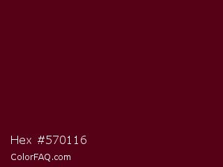 Hex #570116 Color is a very dark red color and the nearest color is Dark Scarlet #560319. Hex code #570116 and RGB value is rgb(87,1,22). In RGB color space, this color is composed of 34% red, 0% green, 9% blue, In CMYK color space, this color is composed of 0% cyan, 99% magenta, 75% yellow , 66% black , In HSL color space, this color has a hue angle of 345° , 98% saturation and 17% lightness.