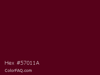Hex #57011a Color is a very dark rose color and the nearest color is Dark Scarlet #560319. Hex code #57011a and RGB value is rgb(87,1,26). In RGB color space, this color is composed of 34% red, 0% green, 10% blue, In CMYK color space, this color is composed of 0% cyan, 99% magenta, 70% yellow , 66% black , In HSL color space, this color has a hue angle of 343° , 98% saturation and 17% lightness.