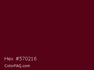 Hex #570216 Color is a very dark red color and the nearest color is Dark Scarlet #560319. Hex code #570216 and RGB value is rgb(87,2,22). In RGB color space, this color is composed of 34% red, 1% green, 9% blue, In CMYK color space, this color is composed of 0% cyan, 98% magenta, 75% yellow , 66% black , In HSL color space, this color has a hue angle of 346° , 96% saturation and 17% lightness.