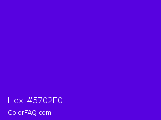 Hex #5702e0 Color is a normal violet color and the nearest color is Han Purple #5218fa. Hex code #5702e0 and RGB value is rgb(87,2,224). In RGB color space, this color is composed of 34% red, 1% green, 88% blue, In CMYK color space, this color is composed of 61% cyan, 99% magenta, 0% yellow , 12% black , In HSL color space, this color has a hue angle of 263° , 98% saturation and 44% lightness.