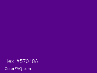 Hex #57048a Color is a dark purple color and the nearest color is Pigment Indigo #4b0082. Hex code #57048a and RGB value is rgb(87,4,138). In RGB color space, this color is composed of 34% red, 2% green, 54% blue, In CMYK color space, this color is composed of 37% cyan, 97% magenta, 0% yellow , 46% black , In HSL color space, this color has a hue angle of 277° , 94% saturation and 28% lightness.