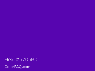 Hex #5705b0 Color is a normal violet color and the nearest color is Purple #660099. Hex code #5705b0 and RGB value is rgb(87,5,176). In RGB color space, this color is composed of 34% red, 2% green, 69% blue, In CMYK color space, this color is composed of 51% cyan, 97% magenta, 0% yellow , 31% black , In HSL color space, this color has a hue angle of 269° , 94% saturation and 35% lightness.