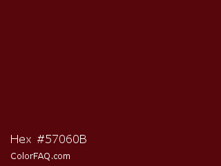 Hex #57060b Color is a very dark red color and the nearest color is Mahogany #4e0606. Hex code #57060b and RGB value is rgb(87,6,11). In RGB color space, this color is composed of 34% red, 2% green, 4% blue, In CMYK color space, this color is composed of 0% cyan, 93% magenta, 87% yellow , 66% black , In HSL color space, this color has a hue angle of 356° , 87% saturation and 18% lightness.