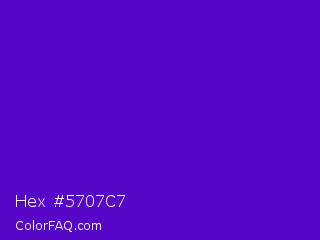 Hex #5707c7 Color is a normal violet color and the nearest color is Interdimensional Blue #360ccc. Hex code #5707c7 and RGB value is rgb(87,7,199). In RGB color space, this color is composed of 34% red, 3% green, 78% blue, In CMYK color space, this color is composed of 56% cyan, 96% magenta, 0% yellow , 22% black , In HSL color space, this color has a hue angle of 265° , 93% saturation and 40% lightness.