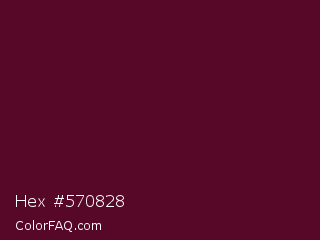 Hex #570828 Color is a very dark rose color and the nearest color is Bordeaux #5c0120. Hex code #570828 and RGB value is rgb(87,8,40). In RGB color space, this color is composed of 34% red, 3% green, 16% blue, In CMYK color space, this color is composed of 0% cyan, 91% magenta, 54% yellow , 66% black , In HSL color space, this color has a hue angle of 336° , 83% saturation and 19% lightness.