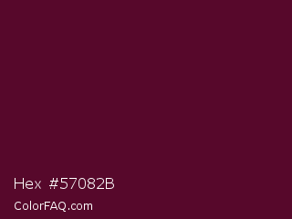 Hex #57082b Color is a very dark rose color and the nearest color is Mulberry Wood #5c0536. Hex code #57082b and RGB value is rgb(87,8,43). In RGB color space, this color is composed of 34% red, 3% green, 17% blue, In CMYK color space, this color is composed of 0% cyan, 91% magenta, 51% yellow , 66% black , In HSL color space, this color has a hue angle of 333° , 83% saturation and 19% lightness.