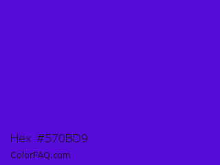 Hex #570bd9 Color is a normal violet color and the nearest color is Interdimensional Blue #360ccc. Hex code #570bd9 and RGB value is rgb(87,11,217). In RGB color space, this color is composed of 34% red, 4% green, 85% blue, In CMYK color space, this color is composed of 60% cyan, 95% magenta, 0% yellow , 15% black , In HSL color space, this color has a hue angle of 262° , 90% saturation and 45% lightness.