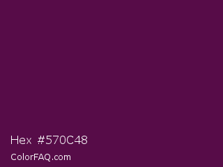 Hex #570c48 Color is a very dark magenta color and the nearest color is Loulou #460b41. Hex code #570c48 and RGB value is rgb(87,12,72). In RGB color space, this color is composed of 34% red, 5% green, 28% blue, In CMYK color space, this color is composed of 0% cyan, 86% magenta, 17% yellow , 66% black , In HSL color space, this color has a hue angle of 312° , 76% saturation and 19% lightness.
