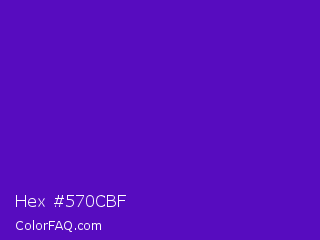 Hex #570cbf Color is a normal violet color and the nearest color is Interdimensional Blue #360ccc. Hex code #570cbf and RGB value is rgb(87,12,191). In RGB color space, this color is composed of 34% red, 5% green, 75% blue, In CMYK color space, this color is composed of 54% cyan, 94% magenta, 0% yellow , 25% black , In HSL color space, this color has a hue angle of 265° , 88% saturation and 40% lightness.