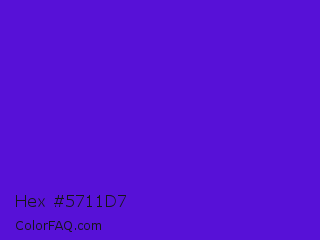 Hex #5711d7 Color is a normal violet color and the nearest color is Interdimensional Blue #360ccc. Hex code #5711d7 and RGB value is rgb(87,17,215). In RGB color space, this color is composed of 34% red, 7% green, 84% blue, In CMYK color space, this color is composed of 60% cyan, 92% magenta, 0% yellow , 16% black , In HSL color space, this color has a hue angle of 261° , 85% saturation and 45% lightness.