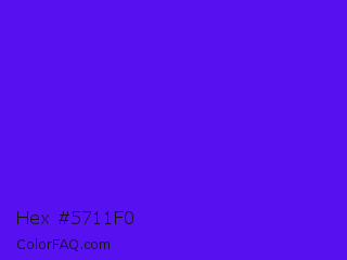 Hex #5711f0 Color is a normal indigo color and the nearest color is Han Purple #5218fa. Hex code #5711f0 and RGB value is rgb(87,17,240). In RGB color space, this color is composed of 34% red, 7% green, 94% blue, In CMYK color space, this color is composed of 64% cyan, 93% magenta, 0% yellow , 6% black , In HSL color space, this color has a hue angle of 259° , 88% saturation and 50% lightness.