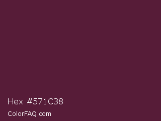 Hex #571c38 Color is a dark rose color and the nearest color is Wine Berry #591d35. Hex code #571c38 and RGB value is rgb(87,28,56). In RGB color space, this color is composed of 34% red, 11% green, 22% blue, In CMYK color space, this color is composed of 0% cyan, 68% magenta, 36% yellow , 66% black , In HSL color space, this color has a hue angle of 332° , 51% saturation and 23% lightness.