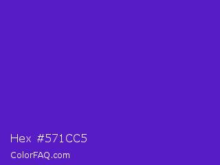 Hex #571cc5 Color is a normal violet color and the nearest color is Purple Heart Crayola #652dc1. Hex code #571cc5 and RGB value is rgb(87,28,197). In RGB color space, this color is composed of 34% red, 11% green, 77% blue, In CMYK color space, this color is composed of 56% cyan, 86% magenta, 0% yellow , 23% black , In HSL color space, this color has a hue angle of 261° , 75% saturation and 44% lightness.