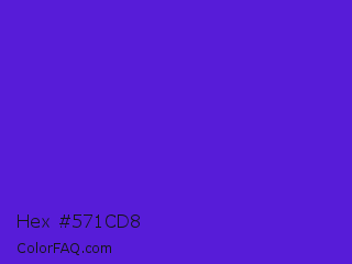 Hex #571cd8 Color is a normal indigo color and the nearest color is Purple Heart Crayola #652dc1. Hex code #571cd8 and RGB value is rgb(87,28,216). In RGB color space, this color is composed of 34% red, 11% green, 85% blue, In CMYK color space, this color is composed of 60% cyan, 87% magenta, 0% yellow , 15% black , In HSL color space, this color has a hue angle of 259° , 77% saturation and 48% lightness.