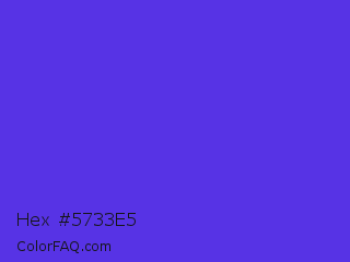 Hex #5733e5 Color is a normal indigo color and the nearest color is Majorelle Blue #6050dc. Hex code #5733e5 and RGB value is rgb(87,51,229). In RGB color space, this color is composed of 34% red, 20% green, 90% blue, In CMYK color space, this color is composed of 62% cyan, 78% magenta, 0% yellow , 10% black , In HSL color space, this color has a hue angle of 252° , 77% saturation and 55% lightness.