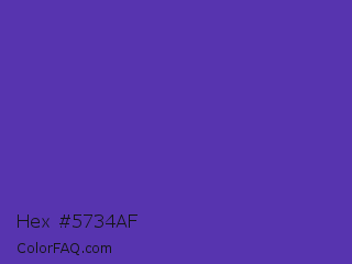 Hex #5734af Color is a normal indigo color and the nearest color is Ocean Blue #4f42b5. Hex code #5734af and RGB value is rgb(87,52,175). In RGB color space, this color is composed of 34% red, 20% green, 69% blue, In CMYK color space, this color is composed of 50% cyan, 70% magenta, 0% yellow , 31% black , In HSL color space, this color has a hue angle of 257° , 54% saturation and 45% lightness.