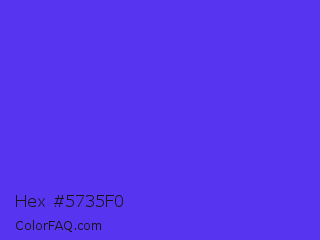 Hex #5735f0 Color is a normal indigo color and the nearest color is Han Purple #5218fa. Hex code #5735f0 and RGB value is rgb(87,53,240). In RGB color space, this color is composed of 34% red, 21% green, 94% blue, In CMYK color space, this color is composed of 64% cyan, 78% magenta, 0% yellow , 6% black , In HSL color space, this color has a hue angle of 251° , 86% saturation and 57% lightness.