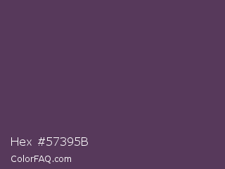 Hex #57395b Color is a dark magenta color and the nearest color is English Violet #563c5c. Hex code #57395b and RGB value is rgb(87,57,91). In RGB color space, this color is composed of 34% red, 22% green, 36% blue, In CMYK color space, this color is composed of 4% cyan, 37% magenta, 0% yellow , 64% black , In HSL color space, this color has a hue angle of 293° , 23% saturation and 29% lightness.