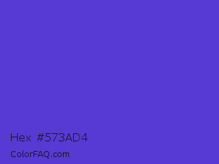 Hex #573ad4 Color is a normal indigo color and the nearest color is Iris #5a4fcf. Hex code #573ad4 and RGB value is rgb(87,58,212). In RGB color space, this color is composed of 34% red, 23% green, 83% blue, In CMYK color space, this color is composed of 59% cyan, 73% magenta, 0% yellow , 17% black , In HSL color space, this color has a hue angle of 251° , 64% saturation and 53% lightness.