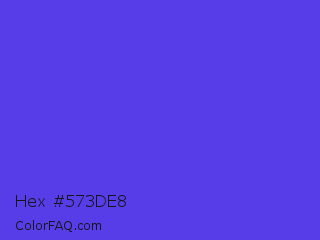 Hex #573de8 Color is a normal indigo color and the nearest color is Majorelle Blue #6050dc. Hex code #573de8 and RGB value is rgb(87,61,232). In RGB color space, this color is composed of 34% red, 24% green, 91% blue, In CMYK color space, this color is composed of 63% cyan, 74% magenta, 0% yellow , 9% black , In HSL color space, this color has a hue angle of 249° , 79% saturation and 57% lightness.