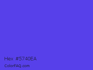 Hex #5740ea Color is a normal indigo color and the nearest color is Majorelle Blue #6050dc. Hex code #5740ea and RGB value is rgb(87,64,234). In RGB color space, this color is composed of 34% red, 25% green, 92% blue, In CMYK color space, this color is composed of 63% cyan, 73% magenta, 0% yellow , 8% black , In HSL color space, this color has a hue angle of 248° , 80% saturation and 58% lightness.