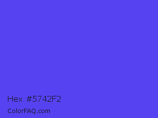 Hex #5742f2 Color is a normal indigo color and the nearest color is Majorelle Blue #6050dc. Hex code #5742f2 and RGB value is rgb(87,66,242). In RGB color space, this color is composed of 34% red, 26% green, 95% blue, In CMYK color space, this color is composed of 64% cyan, 73% magenta, 0% yellow , 5% black , In HSL color space, this color has a hue angle of 247° , 87% saturation and 60% lightness.