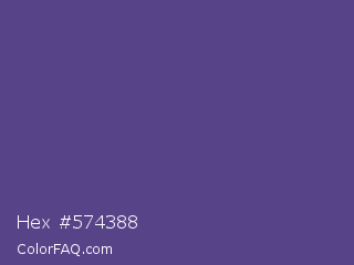 Hex #574388 Color is a normal indigo color and the nearest color is Victoria #534491. Hex code #574388 and RGB value is rgb(87,67,136). In RGB color space, this color is composed of 34% red, 26% green, 53% blue, In CMYK color space, this color is composed of 36% cyan, 51% magenta, 0% yellow , 47% black , In HSL color space, this color has a hue angle of 257° , 34% saturation and 40% lightness.