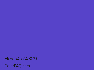 Hex #5743c9 Color is a normal indigo color and the nearest color is Iris #5a4fcf. Hex code #5743c9 and RGB value is rgb(87,67,201). In RGB color space, this color is composed of 34% red, 26% green, 79% blue, In CMYK color space, this color is composed of 57% cyan, 67% magenta, 0% yellow , 21% black , In HSL color space, this color has a hue angle of 249° , 55% saturation and 53% lightness.