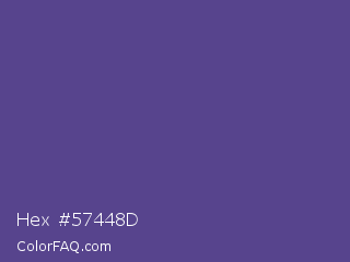 Hex #57448d Color is a normal indigo color and the nearest color is Victoria #534491. Hex code #57448d and RGB value is rgb(87,68,141). In RGB color space, this color is composed of 34% red, 27% green, 55% blue, In CMYK color space, this color is composed of 38% cyan, 52% magenta, 0% yellow , 45% black , In HSL color space, this color has a hue angle of 256° , 35% saturation and 41% lightness.