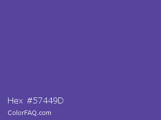 Hex #57449d Color is a normal indigo color and the nearest color is Victoria #534491. Hex code #57449d and RGB value is rgb(87,68,157). In RGB color space, this color is composed of 34% red, 27% green, 62% blue, In CMYK color space, this color is composed of 45% cyan, 57% magenta, 0% yellow , 38% black , In HSL color space, this color has a hue angle of 253° , 40% saturation and 44% lightness.