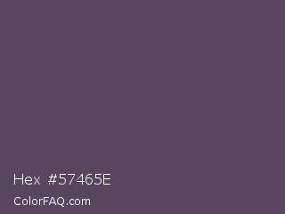 Hex #57465e Color is a normal purple color and the nearest color is Mulled Wine #4e4562. Hex code #57465e and RGB value is rgb(87,70,94). In RGB color space, this color is composed of 34% red, 27% green, 37% blue, In CMYK color space, this color is composed of 7% cyan, 26% magenta, 0% yellow , 63% black , In HSL color space, this color has a hue angle of 283° , 15% saturation and 32% lightness.