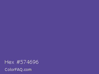 Hex #574696 Color is a normal indigo color and the nearest color is Victoria #534491. Hex code #574696 and RGB value is rgb(87,70,150). In RGB color space, this color is composed of 34% red, 27% green, 59% blue, In CMYK color space, this color is composed of 42% cyan, 53% magenta, 0% yellow , 41% black , In HSL color space, this color has a hue angle of 253° , 36% saturation and 43% lightness.