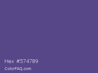 Hex #574789 Color is a normal indigo color and the nearest color is Victoria #534491. Hex code #574789 and RGB value is rgb(87,71,137). In RGB color space, this color is composed of 34% red, 28% green, 54% blue, In CMYK color space, this color is composed of 36% cyan, 48% magenta, 0% yellow , 46% black , In HSL color space, this color has a hue angle of 255° , 32% saturation and 41% lightness.