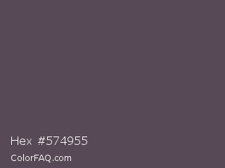 Hex #574955 Color is a normal magenta color and the nearest color is Dark Liver #534b4f. Hex code #574955 and RGB value is rgb(87,73,85). In RGB color space, this color is composed of 34% red, 29% green, 33% blue, In CMYK color space, this color is composed of 0% cyan, 16% magenta, 2% yellow , 66% black , In HSL color space, this color has a hue angle of 309° , 9% saturation and 31% lightness.