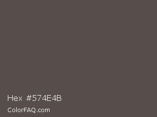 Hex #574e4b Color is a normal color and the nearest color is Fuscous Gray #54534d. Hex code #574e4b and RGB value is rgb(87,78,75). In RGB color space, this color is composed of 34% red, 31% green, 29% blue, In CMYK color space, this color is composed of 0% cyan, 10% magenta, 14% yellow , 66% black , In HSL color space, this color has a hue angle of 15° , 7% saturation and 32% lightness.