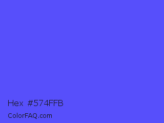 Hex #574ffb Color is a light indigo color and the nearest color is Very Light Blue #6666ff. Hex code #574ffb and RGB value is rgb(87,79,251). In RGB color space, this color is composed of 34% red, 31% green, 98% blue, In CMYK color space, this color is composed of 65% cyan, 69% magenta, 0% yellow , 2% black , In HSL color space, this color has a hue angle of 243° , 96% saturation and 65% lightness.