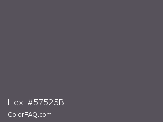 Hex #57525b Color is a normal purple color and the nearest color is Davys Grey #555555. Hex code #57525b and RGB value is rgb(87,82,91). In RGB color space, this color is composed of 34% red, 32% green, 36% blue, In CMYK color space, this color is composed of 4% cyan, 10% magenta, 0% yellow , 64% black , In HSL color space, this color has a hue angle of 273° , 5% saturation and 34% lightness.