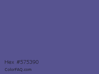 Hex #575390 Color is a normal indigo color and the nearest color is Victoria #534491. Hex code #575390 and RGB value is rgb(87,83,144). In RGB color space, this color is composed of 34% red, 33% green, 56% blue, In CMYK color space, this color is composed of 40% cyan, 42% magenta, 0% yellow , 44% black , In HSL color space, this color has a hue angle of 244° , 27% saturation and 45% lightness.