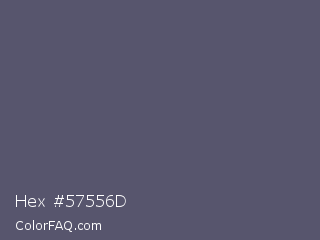 Hex #57556d Color is a normal indigo color and the nearest color is Scarpa Flow #585562. Hex code #57556d and RGB value is rgb(87,85,109). In RGB color space, this color is composed of 34% red, 33% green, 43% blue, In CMYK color space, this color is composed of 20% cyan, 22% magenta, 0% yellow , 57% black , In HSL color space, this color has a hue angle of 245° , 12% saturation and 38% lightness.