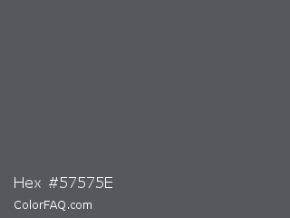 Hex #57575e Color is a normal blue color and the nearest color is Scarpa Flow #585562. Hex code #57575e and RGB value is rgb(87,87,94). In RGB color space, this color is composed of 34% red, 34% green, 37% blue, In CMYK color space, this color is composed of 7% cyan, 7% magenta, 0% yellow , 63% black , In HSL color space, this color has a hue angle of 240° , 4% saturation and 35% lightness.