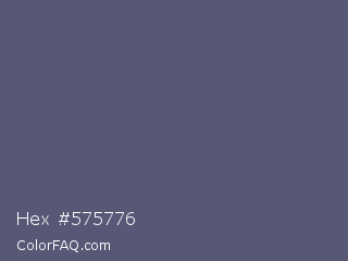 Hex #575776 Color is a normal blue color and the nearest color is Comet #5c5d75. Hex code #575776 and RGB value is rgb(87,87,118). In RGB color space, this color is composed of 34% red, 34% green, 46% blue, In CMYK color space, this color is composed of 26% cyan, 26% magenta, 0% yellow , 54% black , In HSL color space, this color has a hue angle of 240° , 15% saturation and 40% lightness.