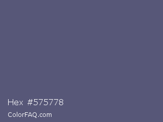Hex #575778 Color is a normal blue color and the nearest color is Comet #5c5d75. Hex code #575778 and RGB value is rgb(87,87,120). In RGB color space, this color is composed of 34% red, 34% green, 47% blue, In CMYK color space, this color is composed of 28% cyan, 28% magenta, 0% yellow , 53% black , In HSL color space, this color has a hue angle of 240° , 16% saturation and 41% lightness.
