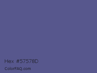 Hex #57578d Color is a normal blue color and the nearest color is Purple Navy #4e5180. Hex code #57578d and RGB value is rgb(87,87,141). In RGB color space, this color is composed of 34% red, 34% green, 55% blue, In CMYK color space, this color is composed of 38% cyan, 38% magenta, 0% yellow , 45% black , In HSL color space, this color has a hue angle of 240° , 24% saturation and 45% lightness.