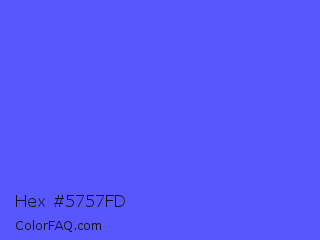 Hex #5757fd Color is a light blue color and the nearest color is Very Light Blue #6666ff. Hex code #5757fd and RGB value is rgb(87,87,253). In RGB color space, this color is composed of 34% red, 34% green, 99% blue, In CMYK color space, this color is composed of 66% cyan, 66% magenta, 0% yellow , 1% black , In HSL color space, this color has a hue angle of 240° , 98% saturation and 67% lightness.