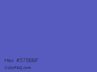 Hex #575bbf Color is a normal blue color and the nearest color is Blue Violet #6456b7. Hex code #575bbf and RGB value is rgb(87,91,191). In RGB color space, this color is composed of 34% red, 36% green, 75% blue, In CMYK color space, this color is composed of 54% cyan, 52% magenta, 0% yellow , 25% black , In HSL color space, this color has a hue angle of 238° , 45% saturation and 55% lightness.